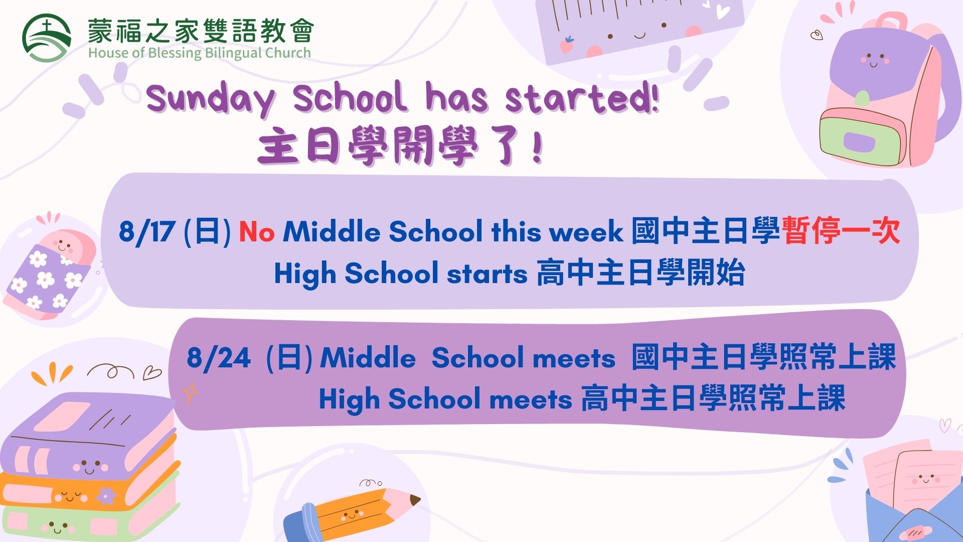 8/17 (日) No Middle School this week 國中主日學暫停一次
